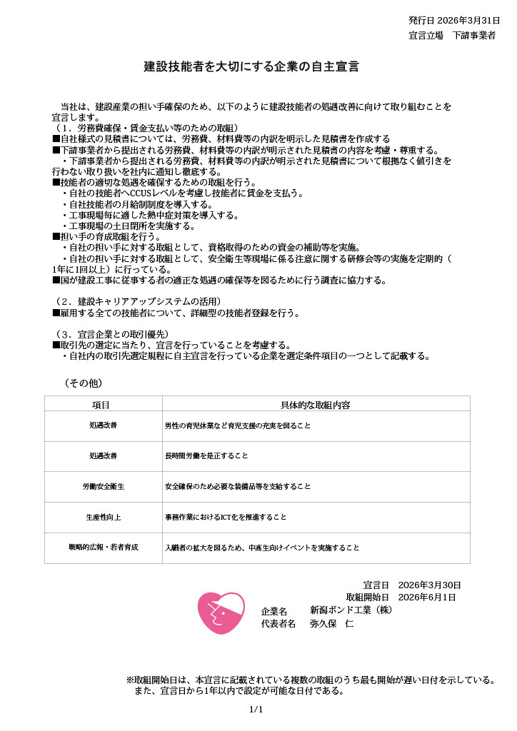 建設技能者を大切にする企業の自主宣言を受理していただきました✨